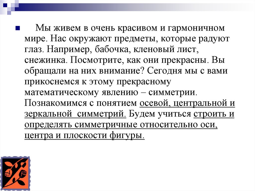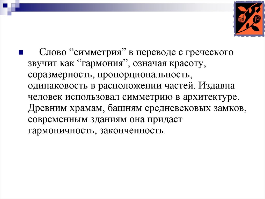 Слово “симметрия” в переводе с греческогозвучит как “гармония”, означая красоту,