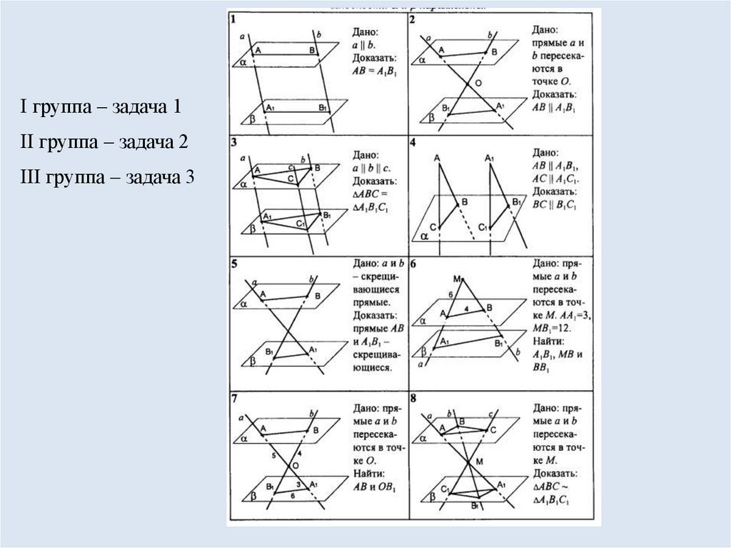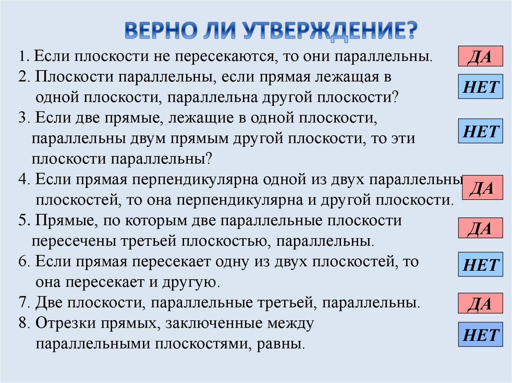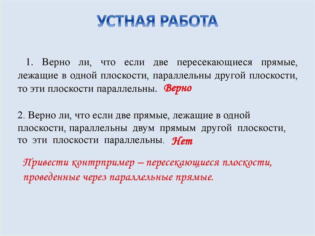 1. Верно ли, что если две пересекающиеся прямые,лежащие в одной плоскости, параллельны другой плоскости,