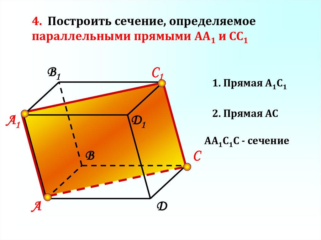 4. Построить сечение, определяемоепараллельными прямыми АА1 и CC1
