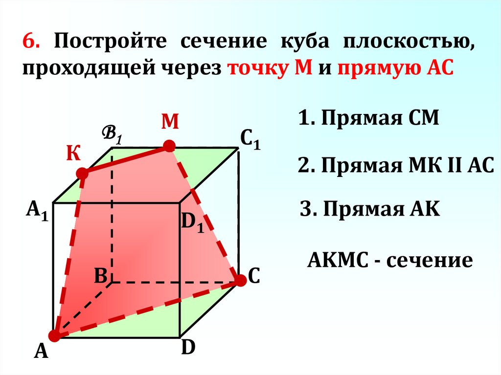 6. Постройте сечение куба плоскостью,проходящей через точку М и прямую АС