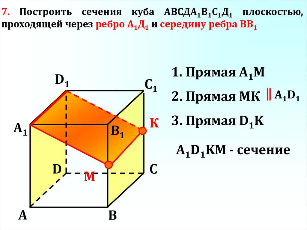 7. Построить сечения куба АВСДА1В1С1Д1 плоскостью,проходящей через ребро А1Д1 и середину ребра ВВ1