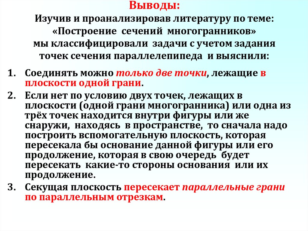 36. Выводы: Изучив и проанализировав литературу по теме: «Построение сечений многогранников» мы классифицировали задачи с учетом