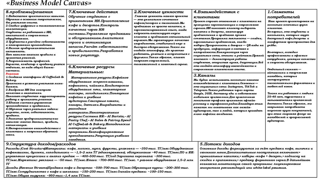Доходы (Revenue Streams)Продажа кофе и десертов: ~500–700 тыс. ТГ/мес.Обучающие курсы: ~200–300 тыс.