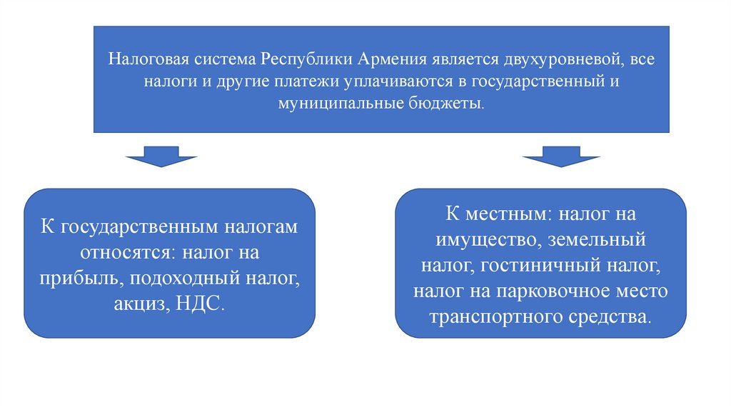 Налоговая система Республики Армения является двухуровневой, всеналоги и другие платежи уплачиваются в государственный и