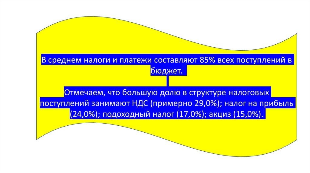 В среднем налоги и платежи составляют 85% всех поступлений вбюджет.