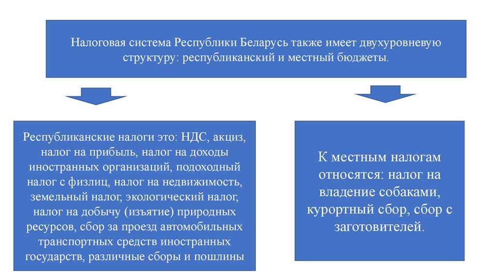Налоговая система Республики Беларусь также имеет двухуровневуюструктуру: республиканский и местный бюджеты.