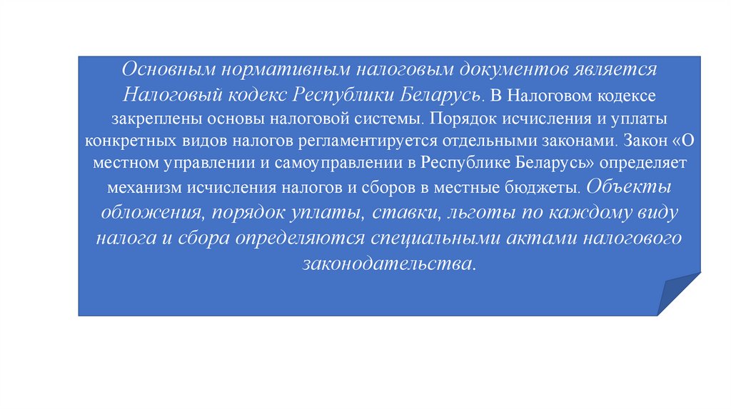 Основным нормативным налоговым документов являетсяНалоговый кодекс Республики Беларусь. В Налоговом кодексе