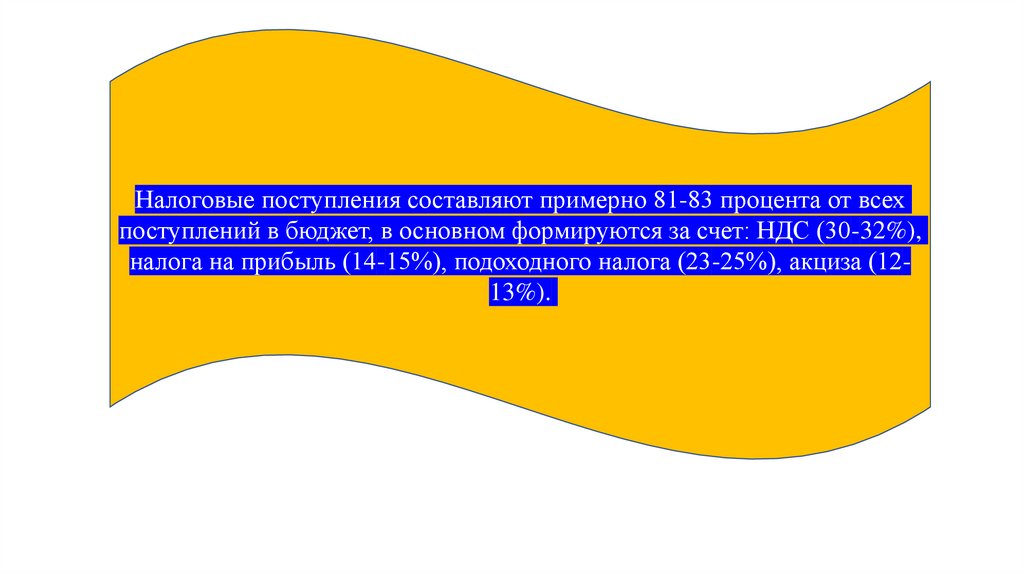 Налоговые поступления составляют примерно 81-83 процента от всехпоступлений в бюджет, в основном формируются за счет: НДС (30-32%),