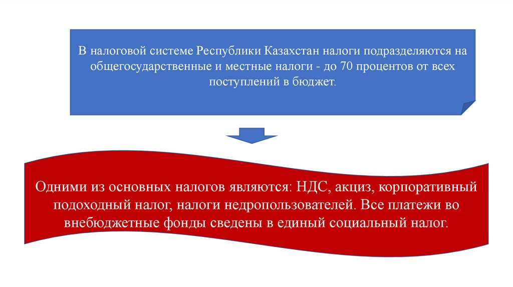 В налоговой системе Республики Казахстан налоги подразделяются наобщегосударственные и местные налоги - до 70 процентов от всех