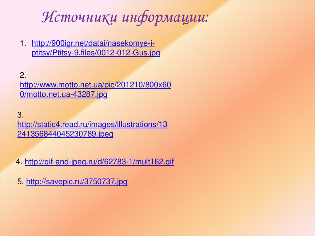 Источники информации:1. http://900igr.net/datai/nasekomye-iptitsy/Ptitsy-9.files/0012-012-Gus.jpg