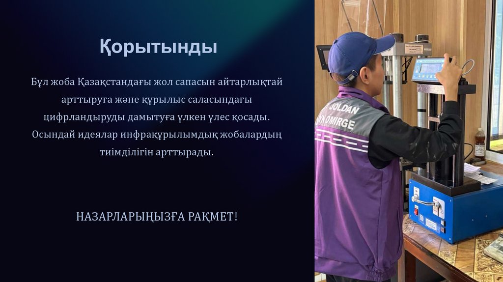 ҚорытындыБұл жоба Қазақстандағы жол сапасын айтарлықтай