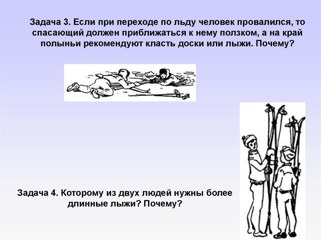 Задача 3. Если при переходе по льду человек провалился, тоспасающий должен приближаться к нему ползком, а на край