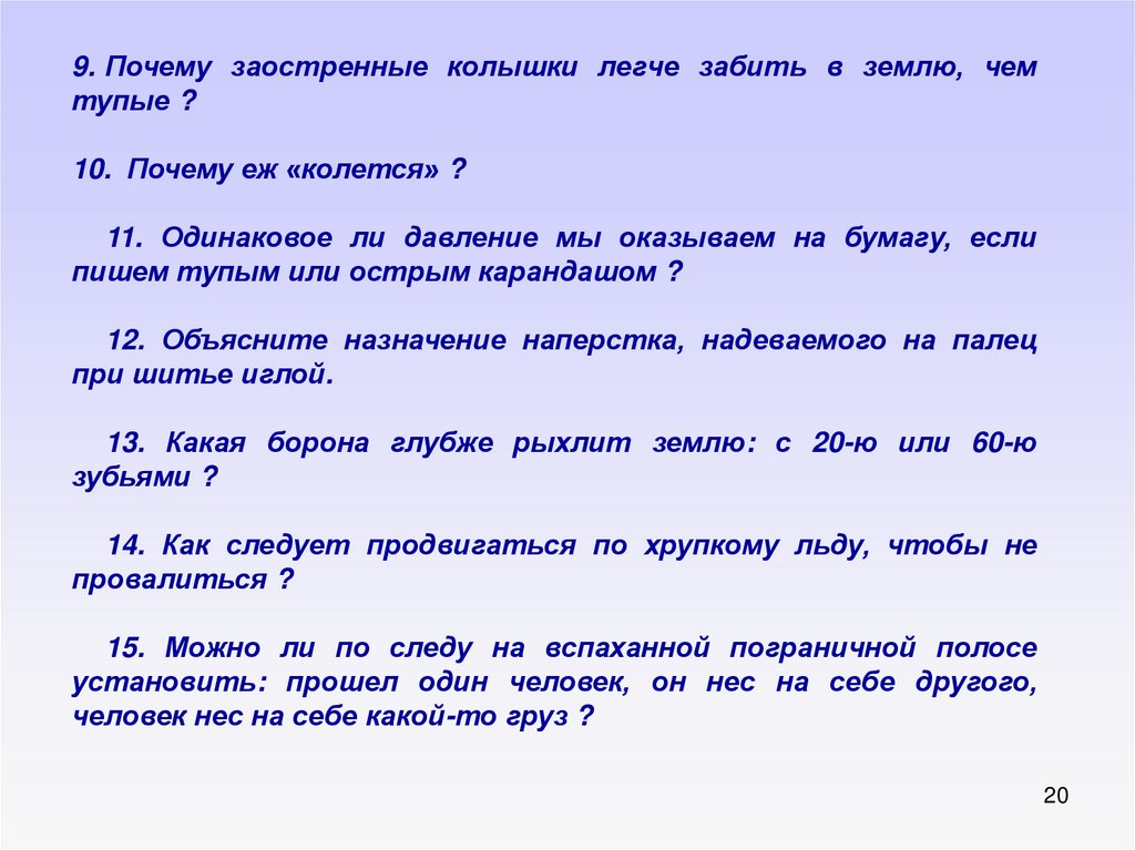 9. Почему заостренные колышки легче забить в землю, чемтупые ?