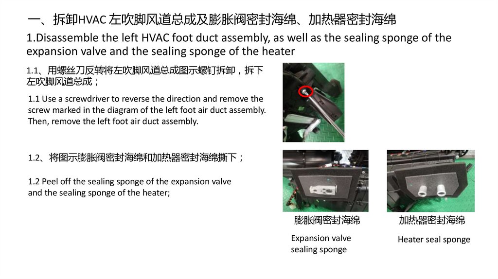 一、拆卸HVAC 左吹脚风道总成及膨胀阀密封海绵、加热器密封海绵1.Disassemble the left HVAC foot duct assembly, as well as the sealing sponge of the