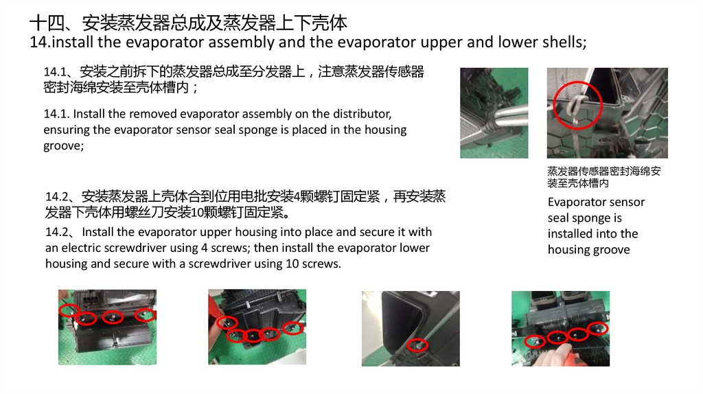 14.1、安装之前拆下的蒸发器总成至分发器上 注意蒸发器传感器