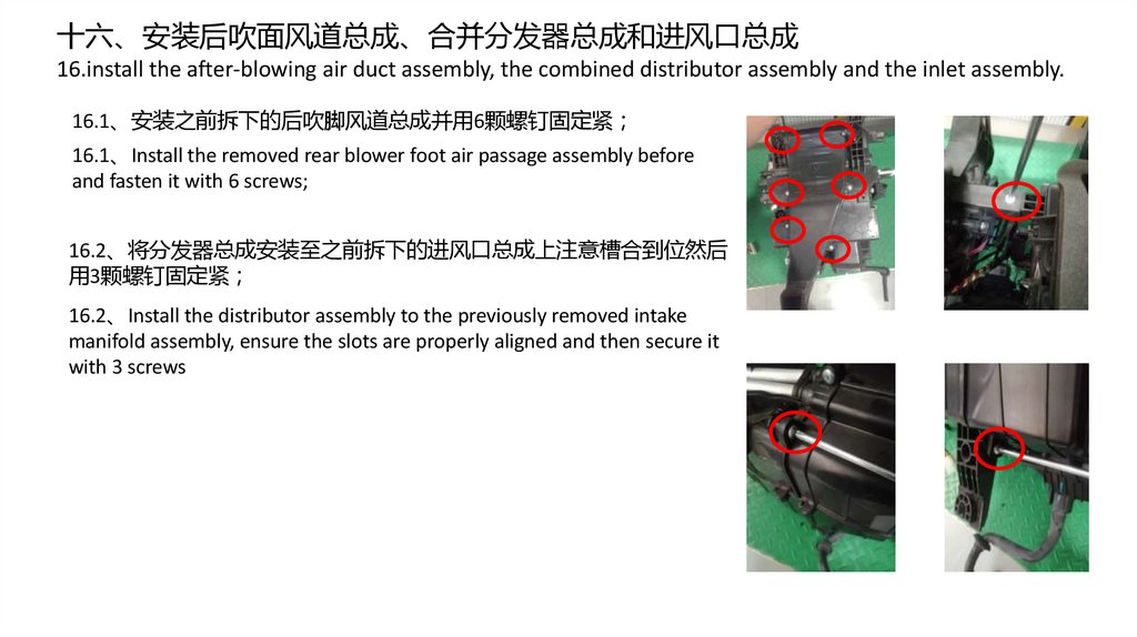 16.1、安装之前拆下的后吹脚风道总成并用6颗螺钉固定紧