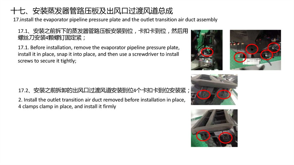 17.1、安装之前拆下的蒸发器管路压板安装到位 卡扣卡到位 然后用