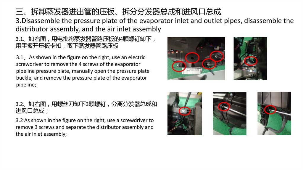 3.1、如右图 用电批将蒸发器管路压板的4颗螺钉卸下