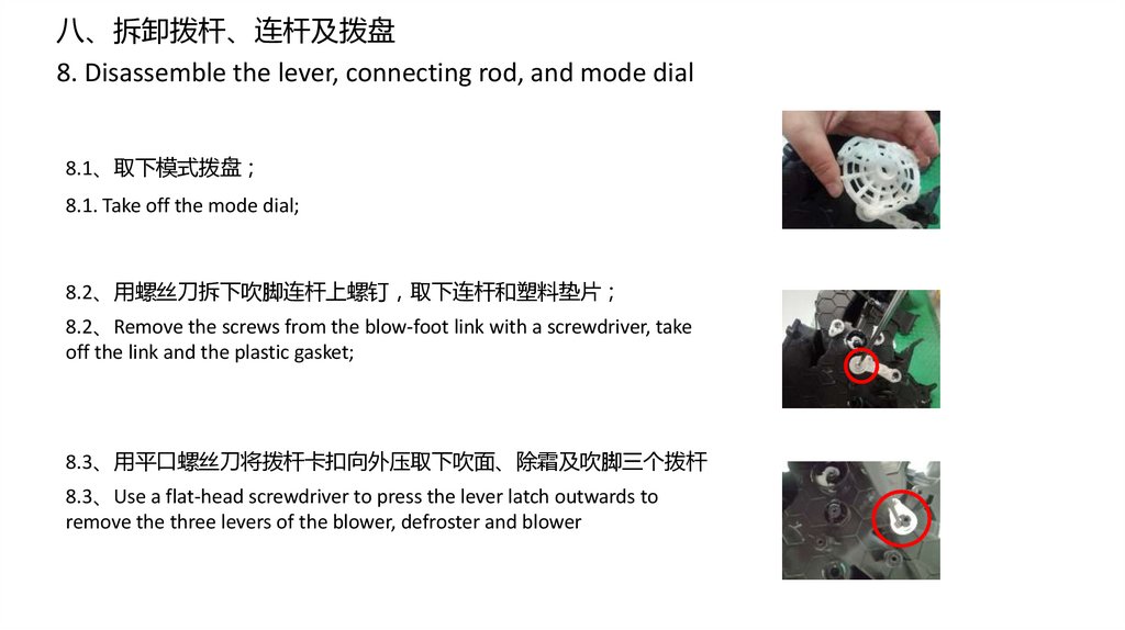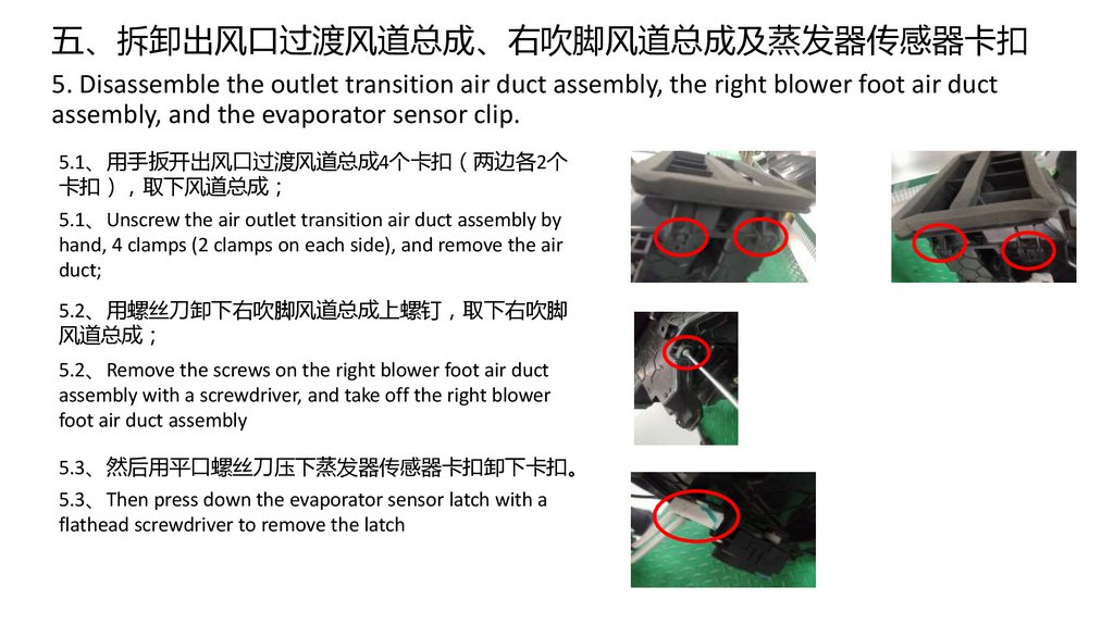 四、拆卸后吹面风道总成及加热器进出管压板和加热器管路压板 取出加热器总成4.Disassemble the rear blowing air duct assembly; Remove the pressure plate of the