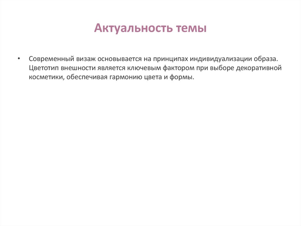 Актуальность темыСовременный визаж основывается на принципах индивидуализации образа.