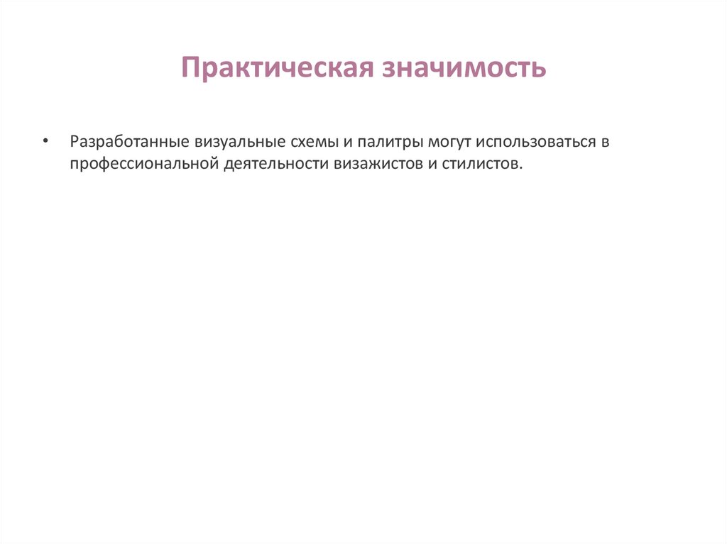 Практическая значимостьРазработанные визуальные схемы и палитры могут использоваться в