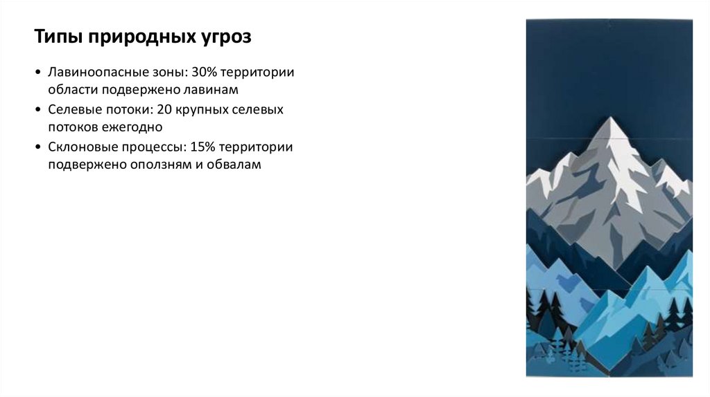 Типы природных угроз• Лавиноопасные зоны: 30% территории