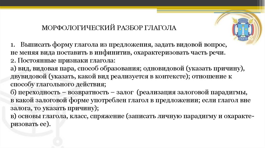 МОРФОЛОГИЧЕСКИЙ РАЗБОР ГЛАГОЛА1. Выписать форму глагола из предложения, задать видовой вопрос,