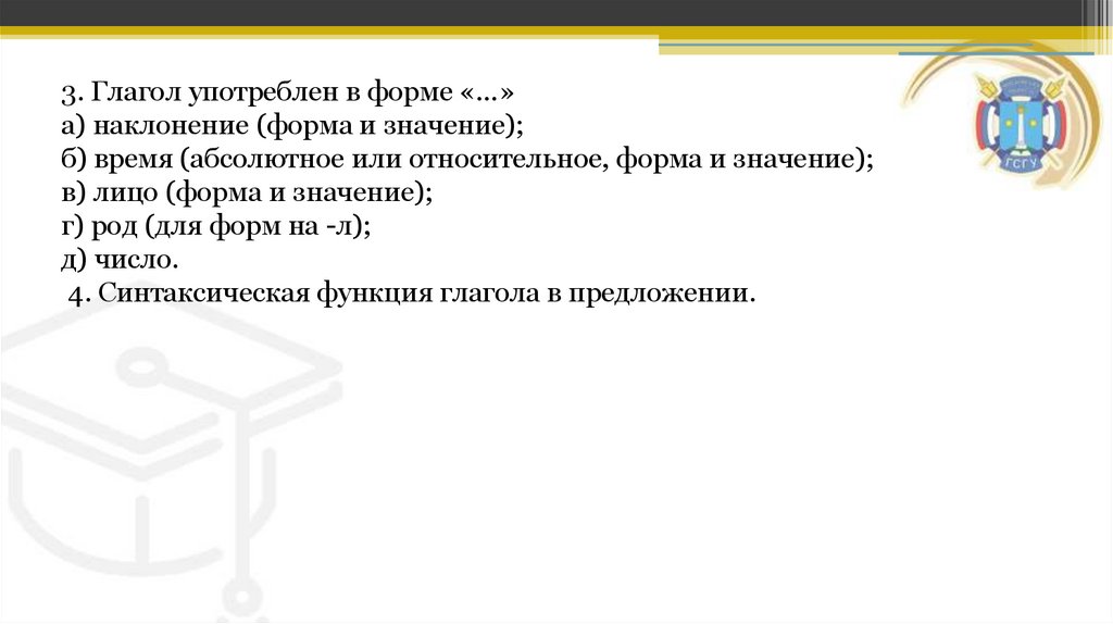 3. Глагол употреблен в форме «…»а) наклонение (форма и значение);