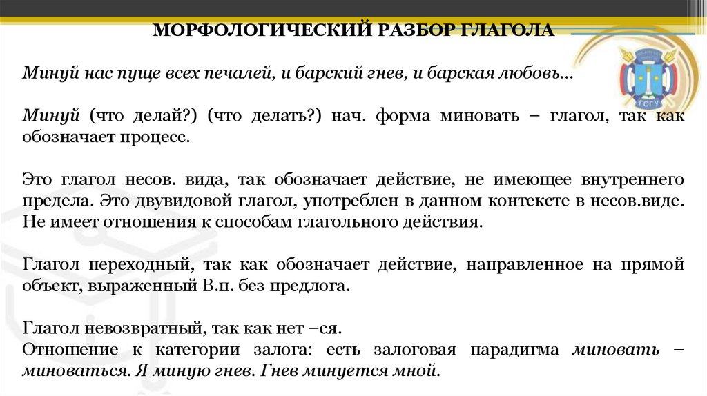 МОРФОЛОГИЧЕСКИЙ РАЗБОР ГЛАГОЛАМинуй нас пуще всех печалей, и барский гнев, и барская любовь…