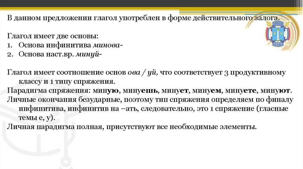 1. Основа инфинитива минова2. Основа наст.вр. минуйГлагол имеет соотношение основ ова / уй, что соответствует 3 продуктивному