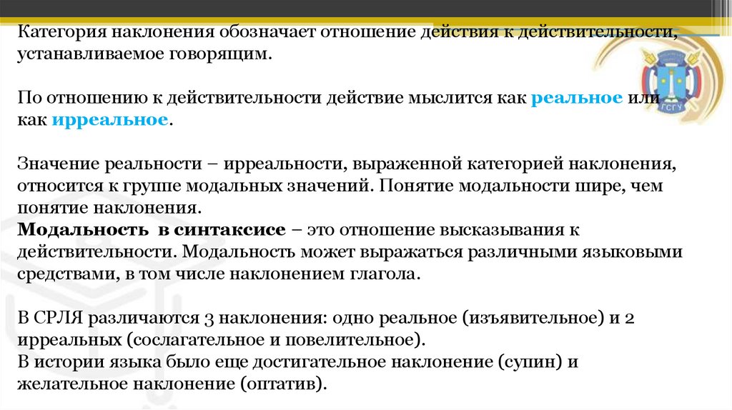 В СРЛЯ различаются 3 наклонения: одно реальное (изъявительное) и 2