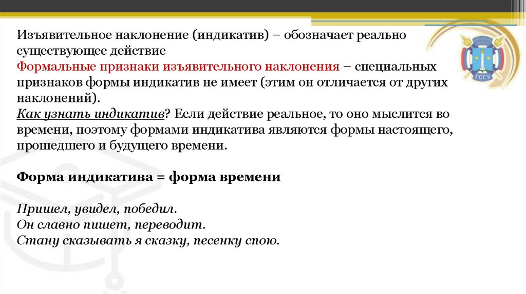 Как узнать индикатив? Если действие реальное, то оно мыслится во