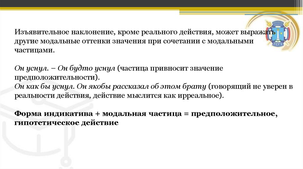 Изъявительное наклонение, кроме реального действия, может выражатьдругие модальные оттенки значения при сочетании с модальными