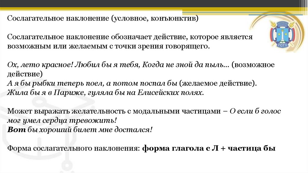 Сослагательное наклонение (условное, конъюнктив)Сослагательное наклонение обозначает действие, которое является