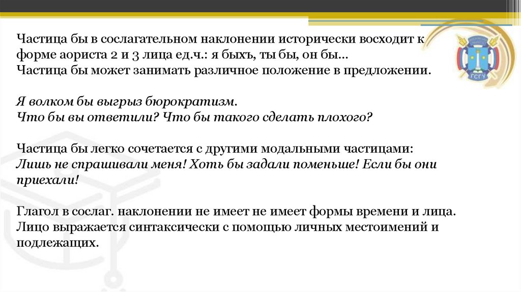 Частица бы в сослагательном наклонении исторически восходит кформе аориста 2 и 3 лица ед.ч.: я быхъ, ты бы, он бы…