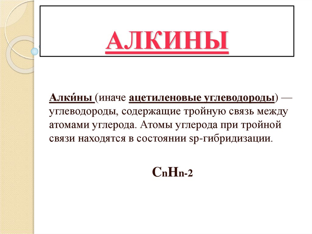 Алки́ны (иначе ацетиленовые углеводороды) —углеводороды, содержащие тройную связь между