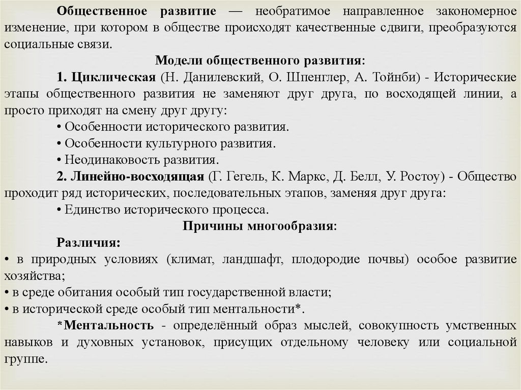 Общественное развитие — необратимое направленное закономерноеизменение, при котором в обществе происходят качественные сдвиги, преобразуются