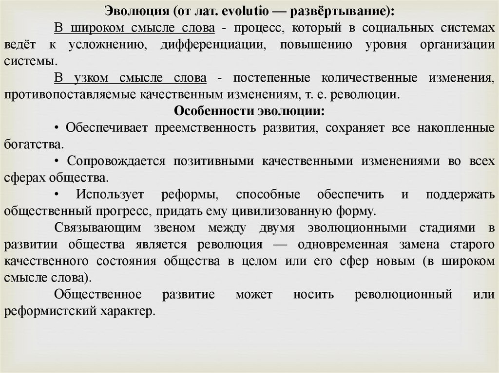 Эволюция (от лат. еvolutio — развёртывание):В широком смысле слова - процесс, который в социальных системах