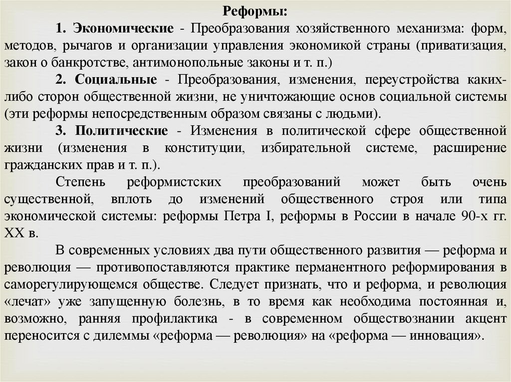 2. Социальные - Преобразования, изменения, переустройства какихлибо сторон общественной жизни, не уничтожающие основ социальной системы