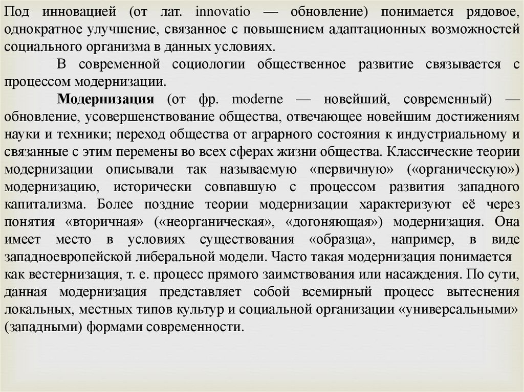 Под инновацией (от лат. innovatio — обновление) понимается рядовое,однократное улучшение, связанное с повышением адаптационных возможностей