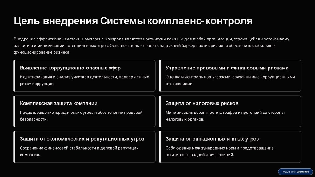 Цель внедрения Системы комплаенс-контроляВнедрение эффективной системы комплаенс-контроля является критически важным для любой организации, стремящейся к устойчивому