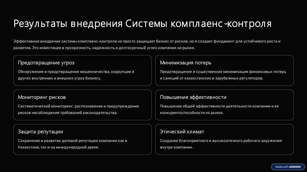 Резул ьтаты в недрения Системы компл аенс -контроляЭффективное внедрение системы комплаенс-контроля не просто защищает бизнес от рисков, но и создает фундамент для устойчивого роста и
