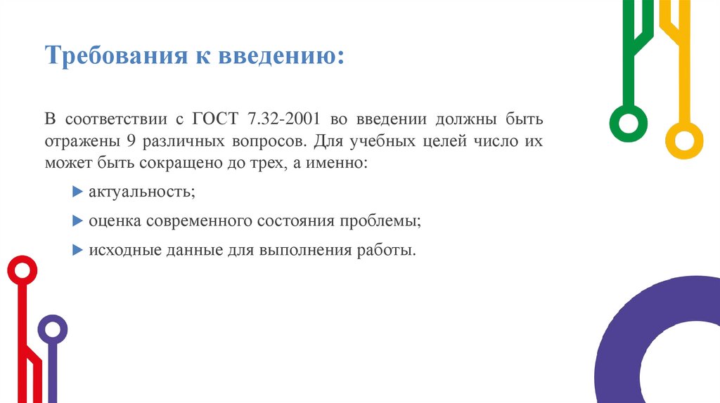 Требования к введению:В соответствии с ГОСТ 7.32-2001 во введении должны быть