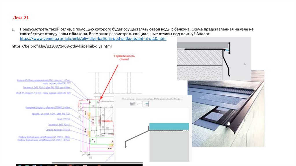 Предусмотреть такой отлив, с помощью которого будет осуществлять отвод воды с балкона. Схема представленная на узле не