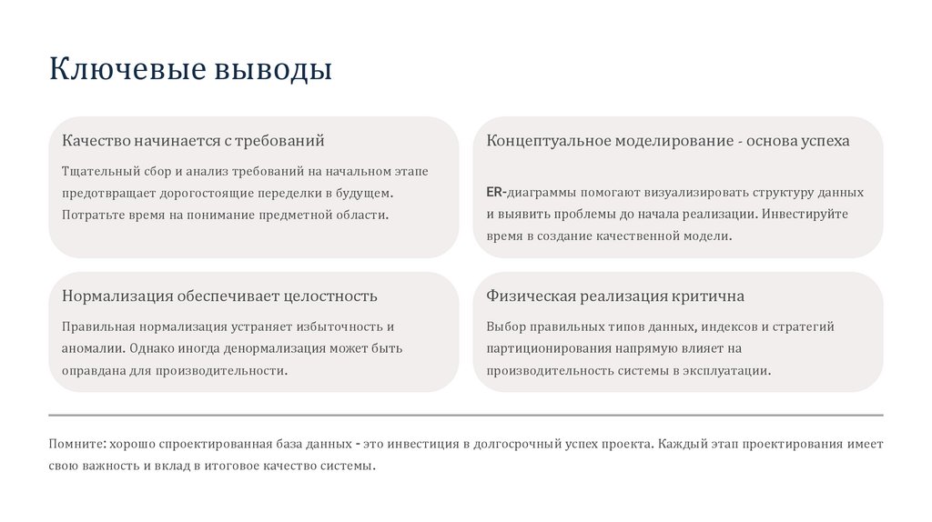 Помните: хорошо спроектированная база данных - это инвестиция в долгосрочный успех проекта. Каждый этап проектирования имеет