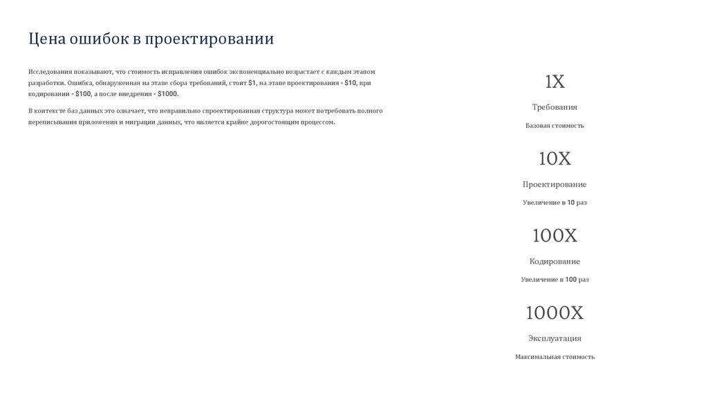 Цена ошибок в проектированииИсследования показывают, что стоимость исправления ошибок экспоненциально возрастает с каждым этапом