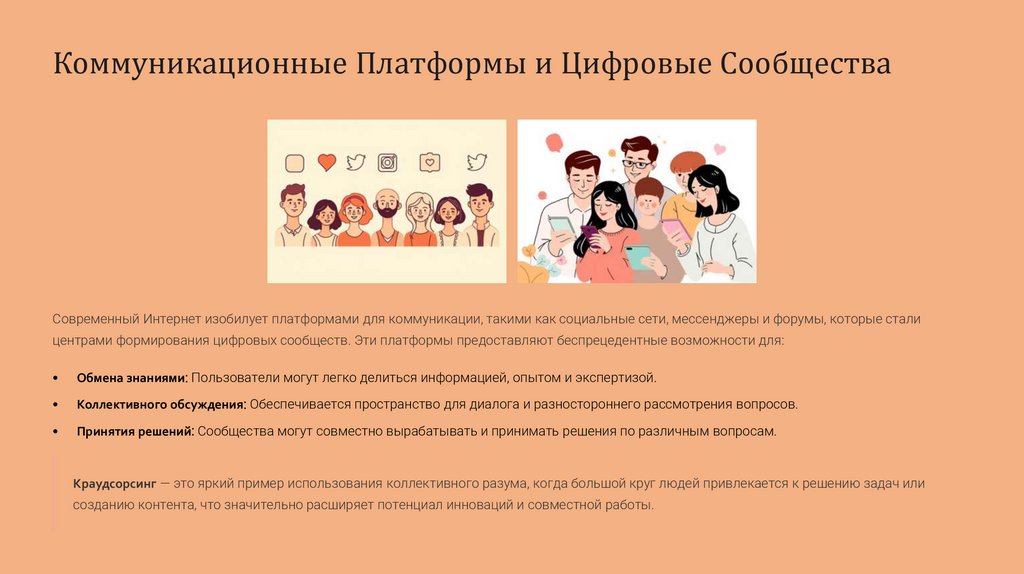 Коммуникационные Платформы и Цифровые СообществаСовременный Интернет изобилует платформами для коммуникации, такими как социальные сети, мессенджеры и форумы, которые стали