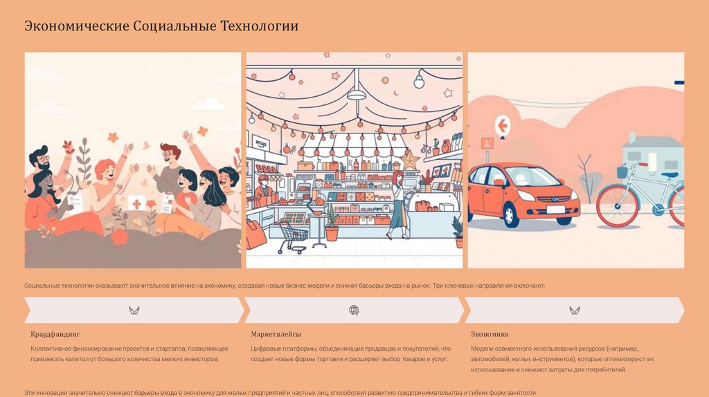 Экономические Социальные ТехнологииСоциальные технологии оказывают значительное влияние на экономику, создавая новые бизнес-модели и снижая барьеры входа на рынок. Три ключевых направления включают: