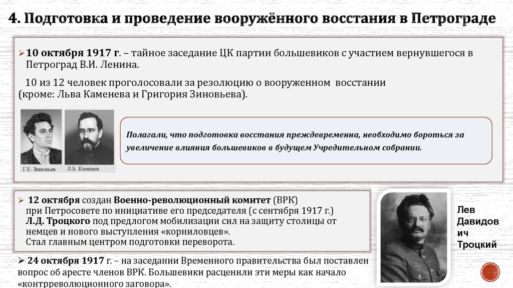 10 октября 1917 г. – тайное заседание ЦК партии большевиков с участием вернувшегося вПетроград В.И. Ленина.