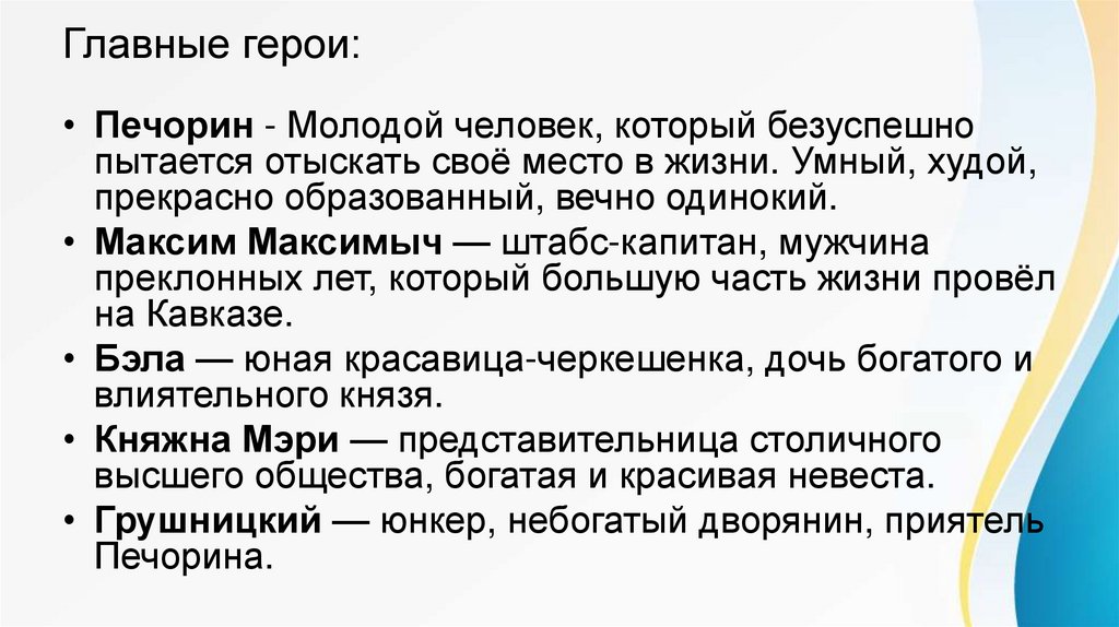 Главные герои:• Печорин - Молодой человек, который безуспешно